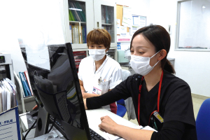 透析室看護師とケアの方針を共有する野津副主任(右)