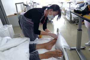 野津副主任は13年の同院入職以降、急性期一般病棟に勤務し、NP取得前から透析患者さんや泌尿器科の患者さんなどに対応。NP取得後、具体的には創傷処置、血液ガス分析(動脈血採取)、末梢留置型中心静脈カテーテル(PICC)の挿入といった侵襲的処置や、患者さんの状態変化に関する看護師からのファーストコールへの対応(初期アセスメント)、透析回診、ドライウェイト(透析後の適正体重)の調整など幅広く手がける。